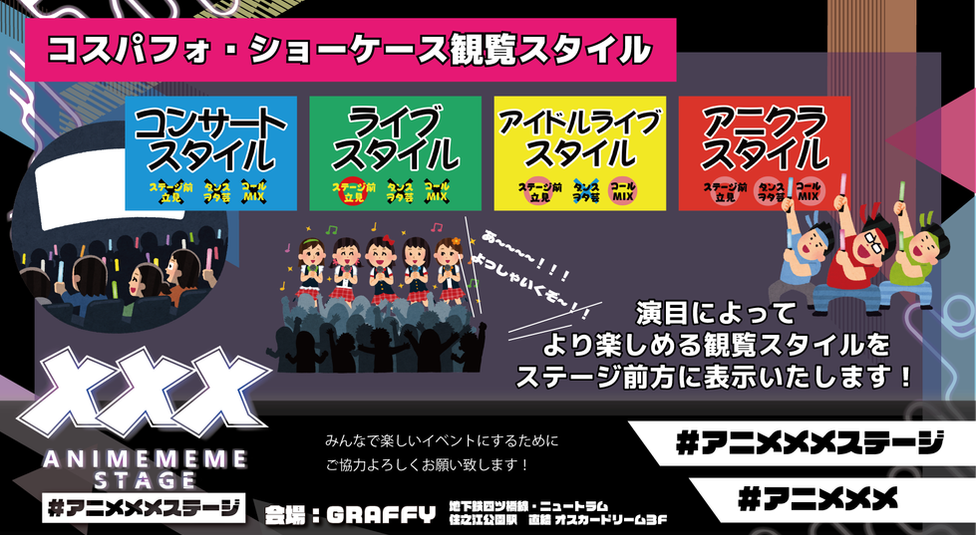 ・ショーケースの演目はダンス、サイリウムヲタ芸、ジャグリング等アイテムを使ったパフォーマンスなど